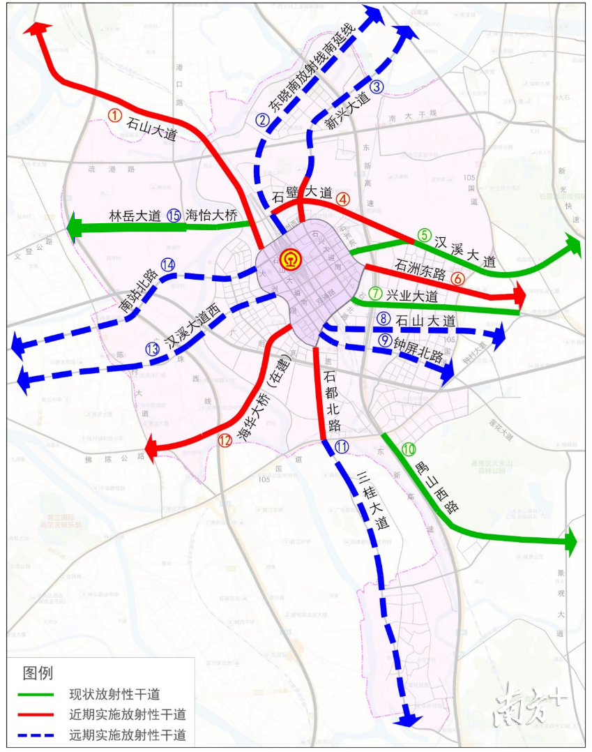 同時延續原控規規劃的放射路網骨架,加快10條放射性主干道建設,打造南站本體15分鐘快速集散系統。同時南站地區建設16座公交站場,包括4座樞紐站和12座首末站;社會停車場11處,約6100個泊位。