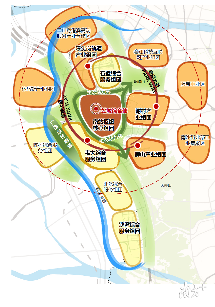 面向粵港澳大灣區全面合作的門戶樞紐,引導南站及周邊地區從交通集散樞紐,向粵港澳大灣區高端要素全球配置的門戶樞紐轉型。